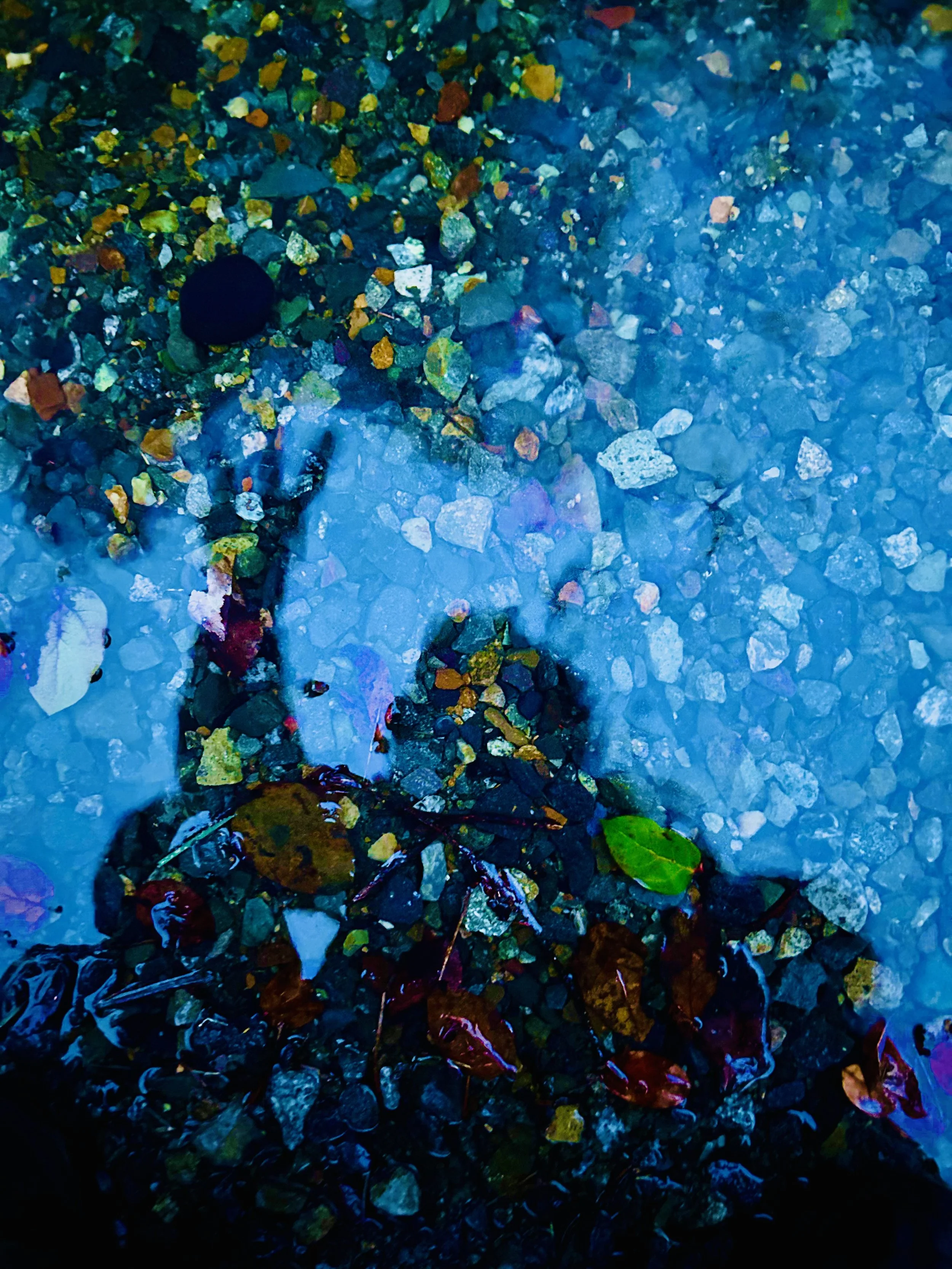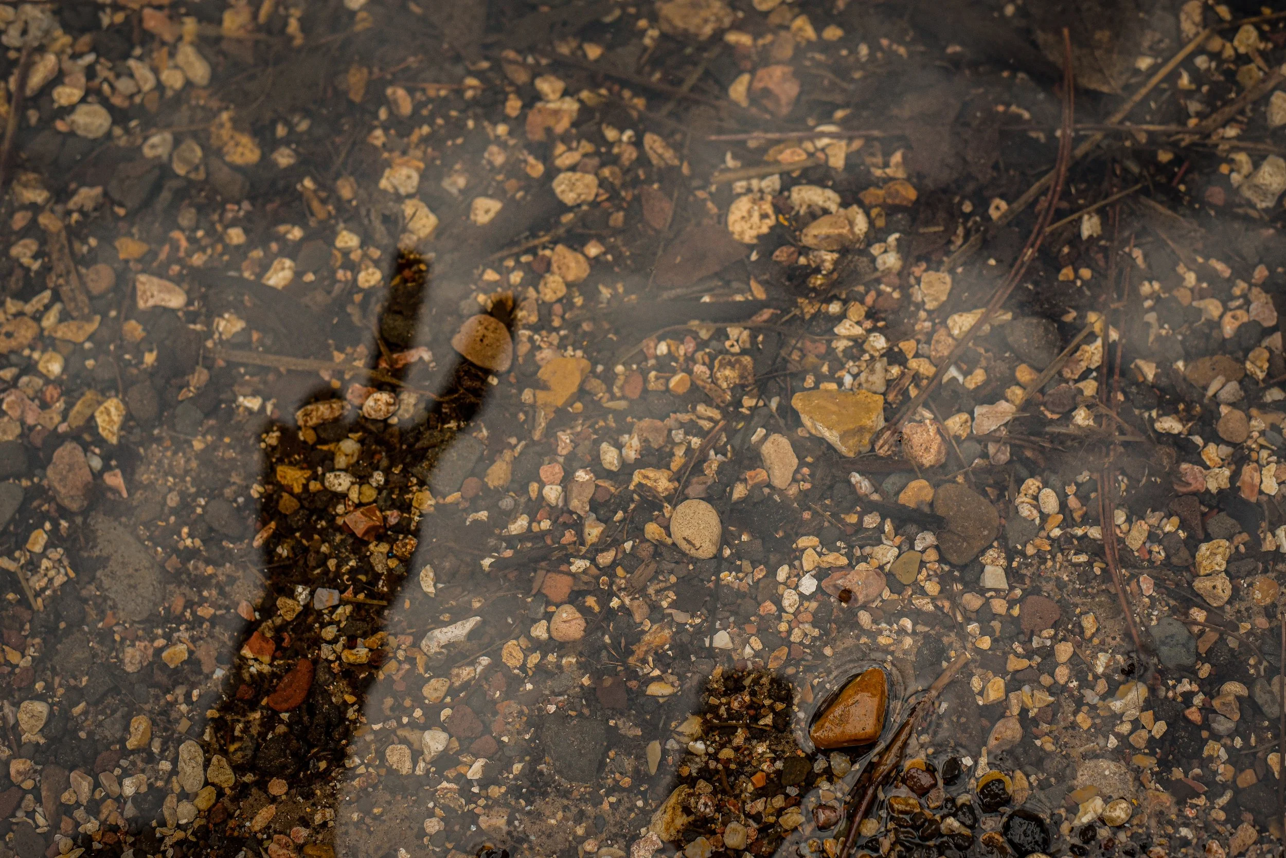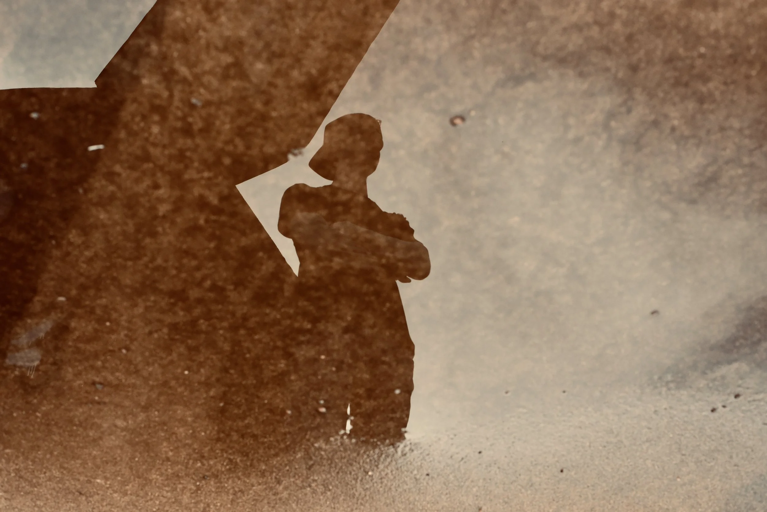 In the puddle’s mirror, a shadowy silhouette meets a curious gaze, as if the reflection is a forgotten self or an inner voice seeking acknowledgment. The rippling water hints at a quiet conversation with a deeper, perhaps forgotten, aspect of one’s being.