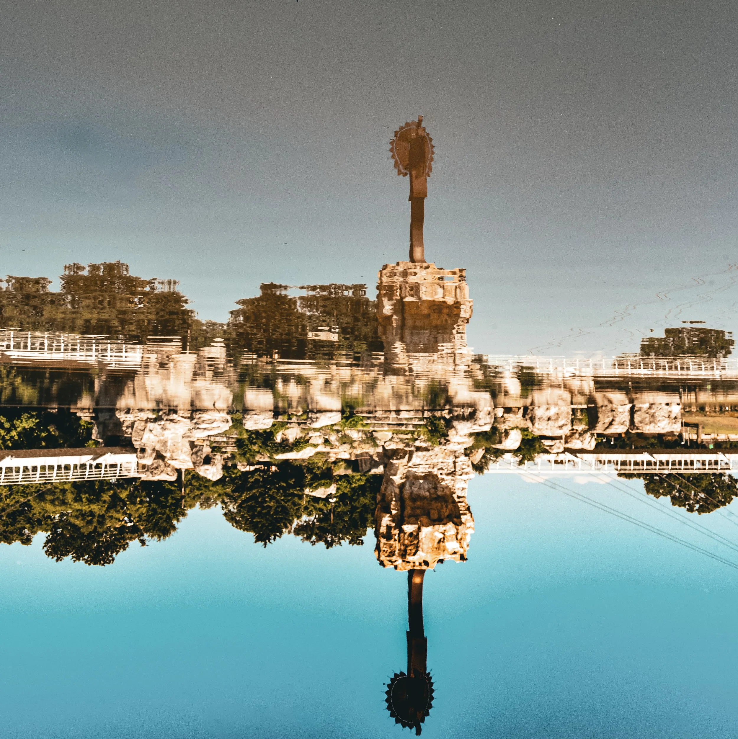 The statue stands as a guardian, both in reality and in its watery reflection, symbolizing balance, reverence, and spiritual harmony with nature. The reflection emphasizes the stillness and enduring legacy of the Plains tribes, making it a striking symbol of unity between land, water, and spirit.